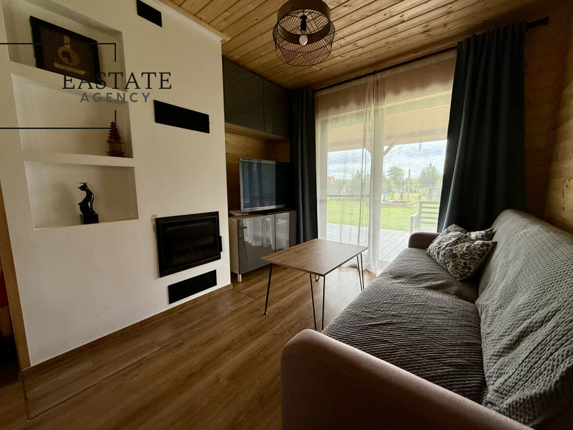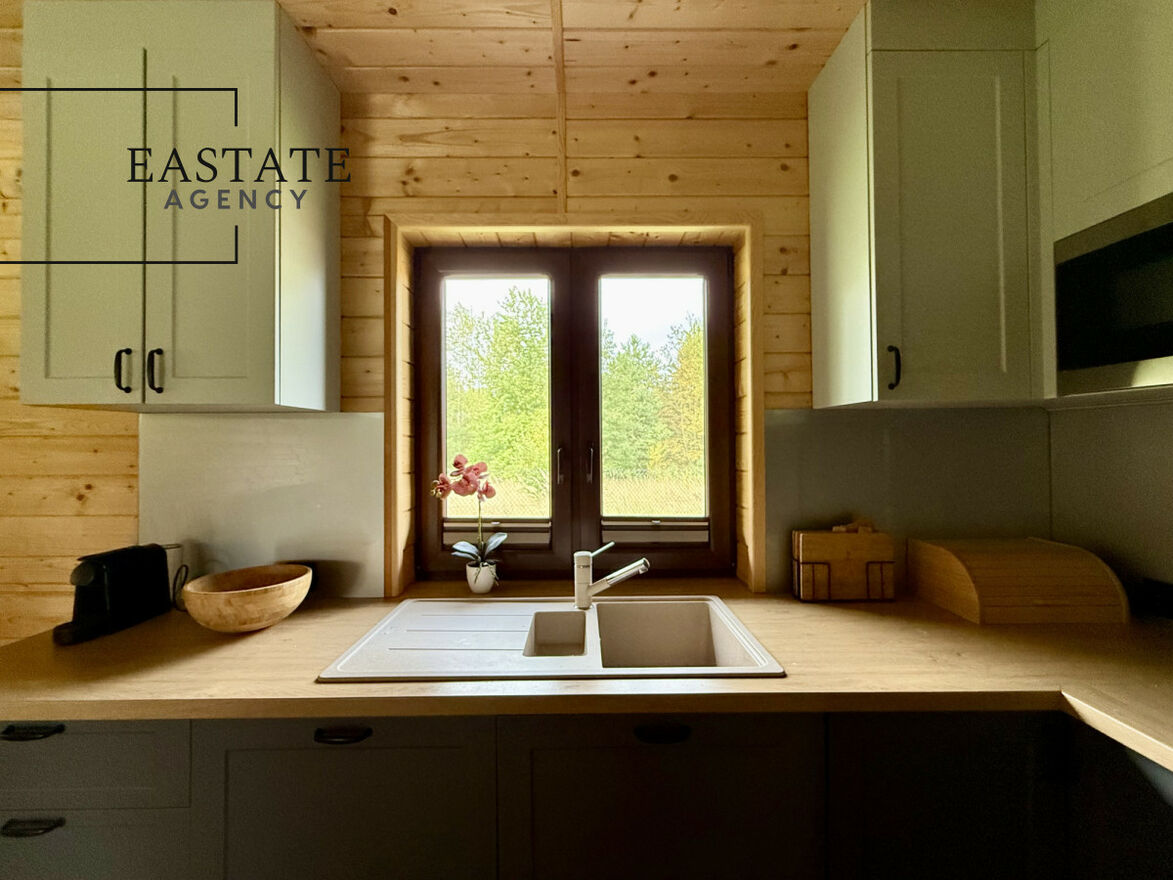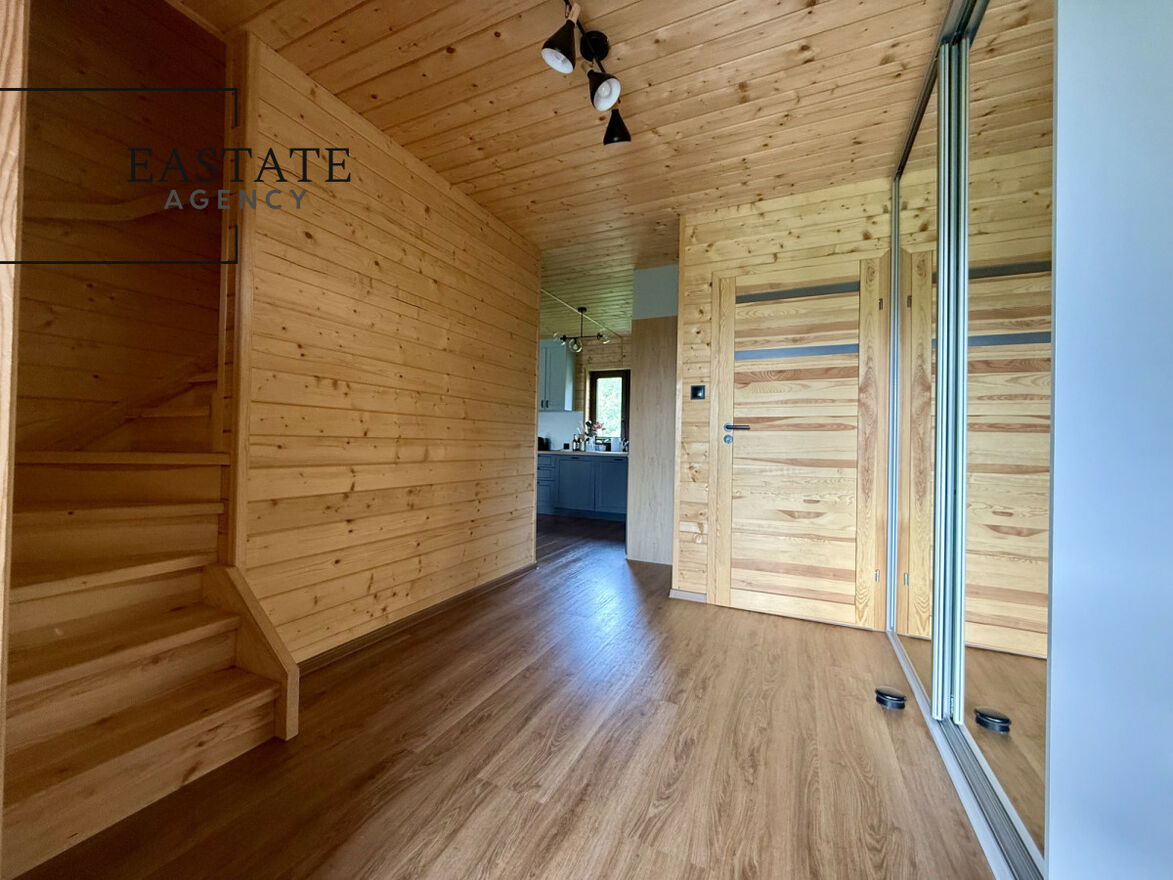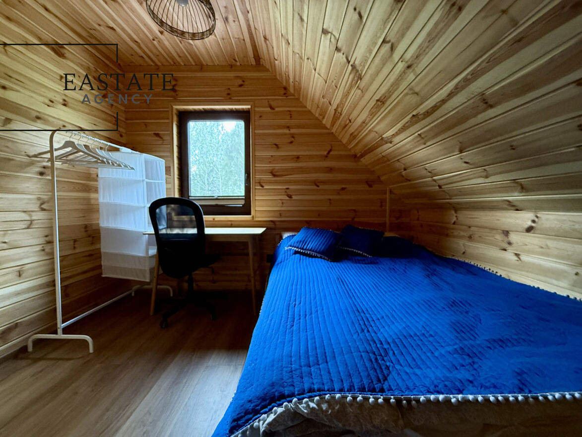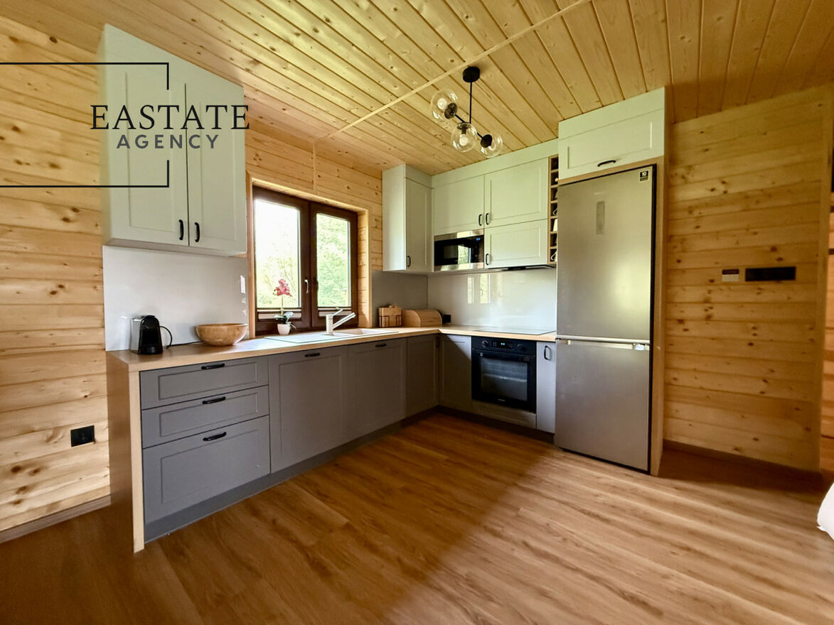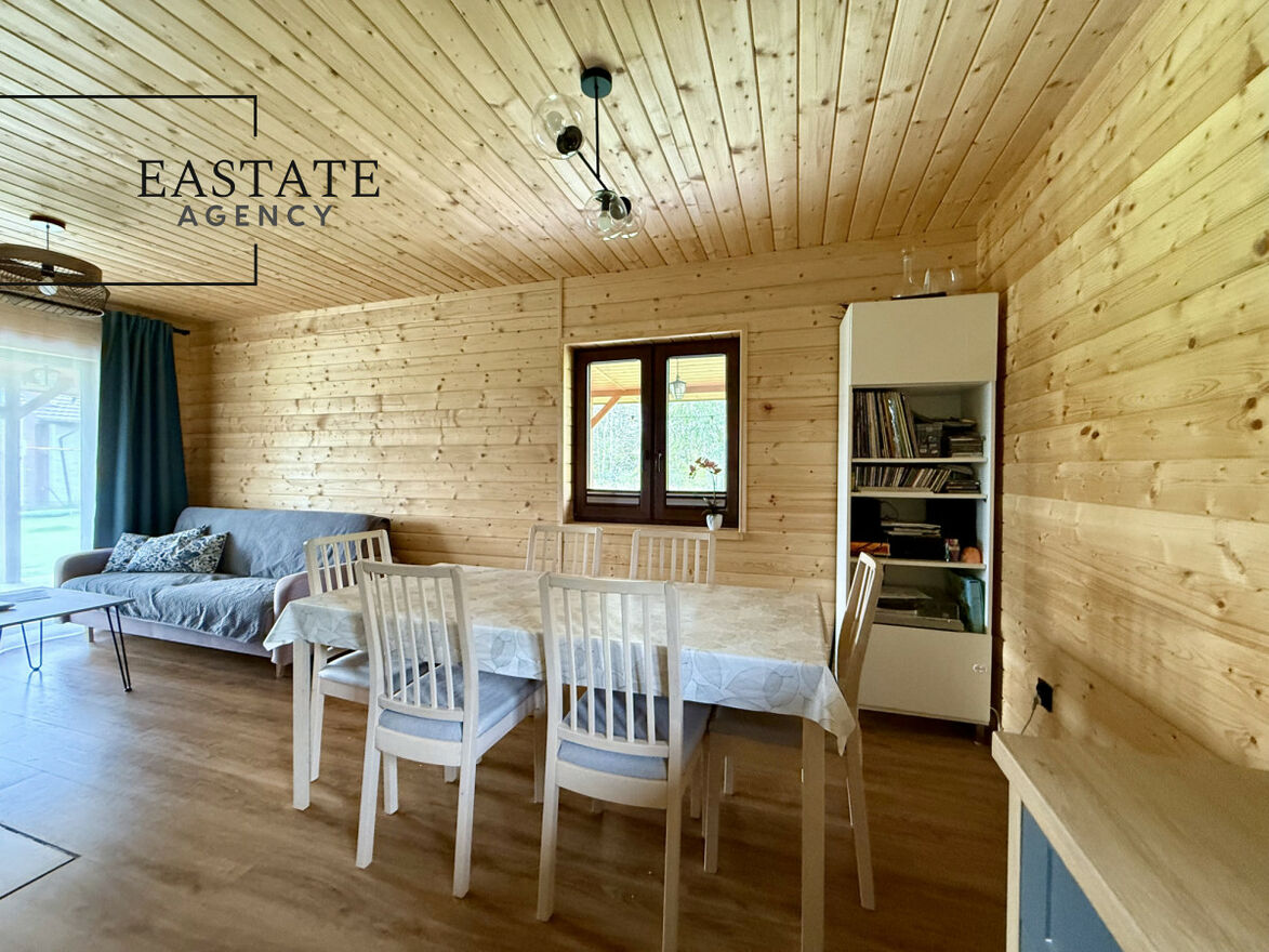 Nowoczesność i funkcjonalność - dom z 2022 roku, zbudowany w technologii szkieletowej na płycie fundamentowej, ocieplony i wykończony półbalem. Przemyślany układ pomieszczeń - 3 sypialnie, 2 łazienki, przestronny salon z kominkiem i w pełni wyposażona kuchnia.