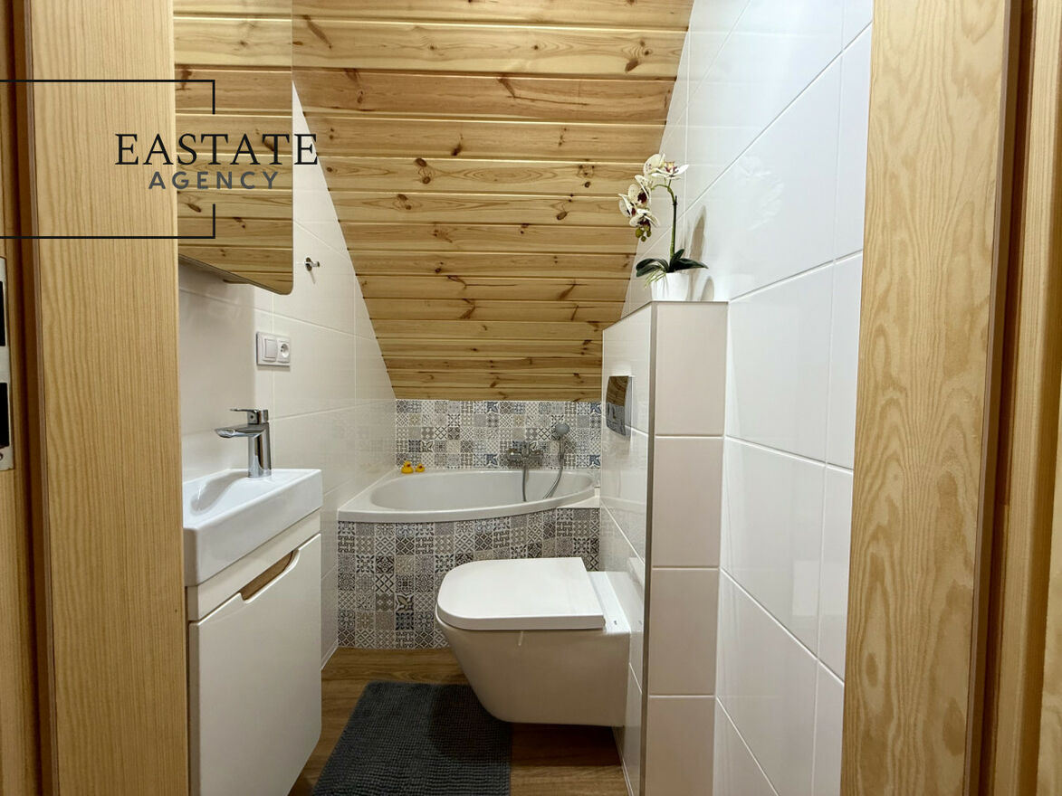 - Łazienka z narożną wanną i toaletą w zabudowie.
